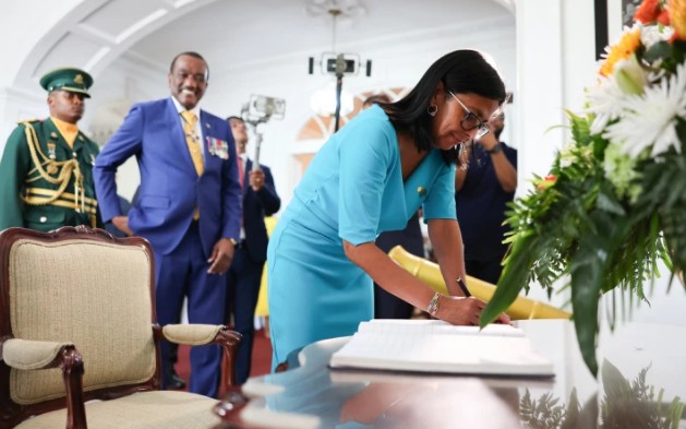 La mandataria fue recibida por el jefe de Estado Jeffrey Bostic en la casa de Gobierno