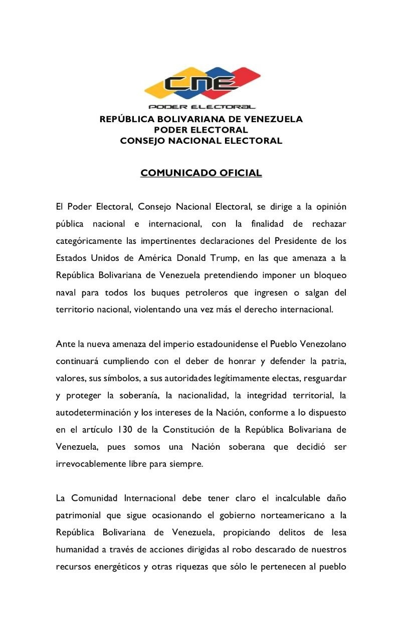 17/12/25.- El Poder Electoral, Consejo Nacional Electoral, rechazó categóricamente las impertinentes declaraciones del presidente de los Estados Unidos (EEUU), Donald Trump, en las que amenaza a Venezuela, pretendiendo imponer un bloqueo naval para todos los buques petroleros que ingresen o salgan del territorio nacional.