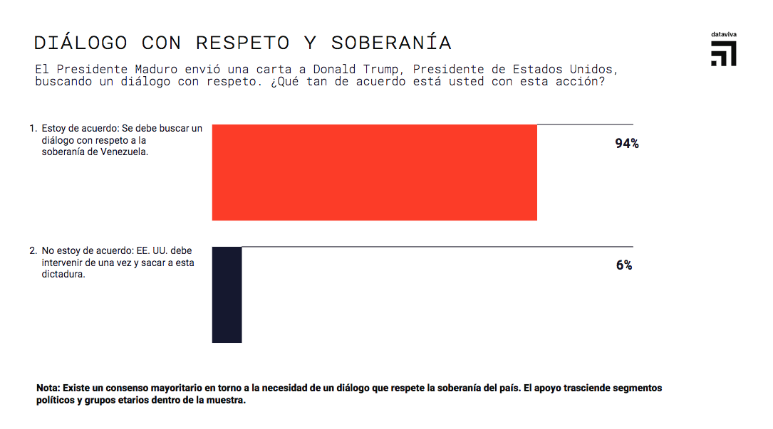 De acuerdo con los resultados, la gran mayoría de los consultados está de acuerdo con la carta enviada por el presidente Nicolás Maduro a su par de Estados Unidos, Donald Trump, en la que propone un diálogo sobre la base del respeto mutuo y la independencia de Venezuela. Solo un 6 % se mostró en desacuerdo, considerando la intervención extranjera como una alternativa, a lo cual destaca la firmeza del sentimiento popular en defensa del Estado venezolano y su autonomía.