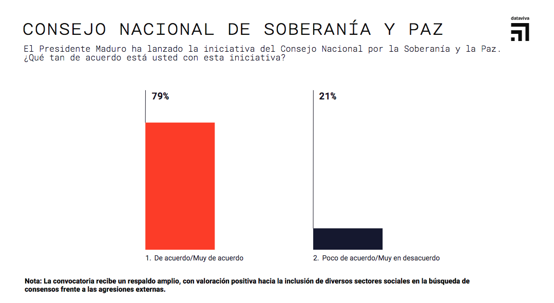 La medición también registró que el 79 % de los encuestados respalda la celebración del Consejo Nacional por la Soberanía y la Paz, iniciativa propuesta por el presidente de la República, Nicolás Maduro, concebido como un espacio de convocatoria amplia e incluyente de los distintos sectores sociales, para dar respuesta a las agresiones contra el país. Un 21 % de los entrevistados no está de acuerdo con esta propuesta.