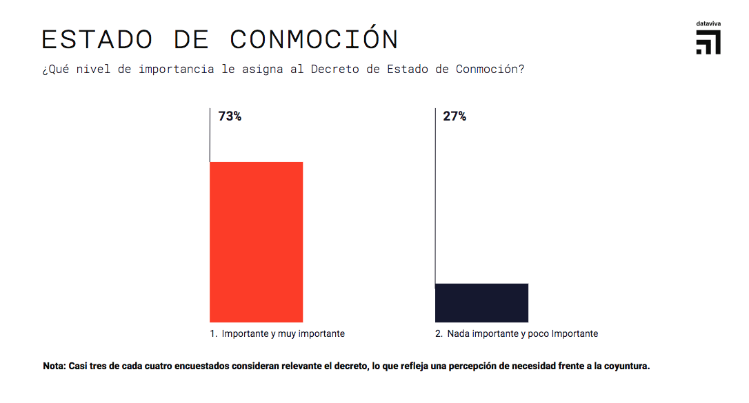 Respecto al Decreto de Estado de Conmoción, firmado por el jefe de Estado, el 73 % de los encuestados lo considera importante o muy importante, reflejando sensibilidad ciudadana ante la coyuntura y el respaldo a la adopción de medidas extraordinarias en defensa de la estabilidad nacional, mientras que el 27 % restante no lo considera relevante.