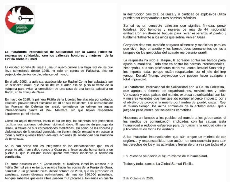 02/10/25.- La Plataforma Internacional de Solidaridad con la Causa Palestina, emitió un comunicado contundente este jueves, expresando su solidaridad con los tripulantes de la flotilla Global Sumud y condenando lo que describen como un ataque de la entidad israelí para impedir la entrega de ayuda humanitaria en Gaza.
