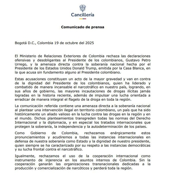 19/10/25.- El Gobierno colombiano rechazó las recientes declaraciones del presidente estadounidense, Donald Trump, respecto a su homólogo colombiano, Gustavo Petro, a quien acusó de fomentar la producción y la distribución de drogas.