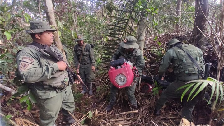 Agregó que “empleando una URRA (Unidad de Reacción Rápida) de combate mixta, en misiones de patrullaje de área y zona en el municipio Atabapo, se localizó, detectó y destruyó un campamento minero, materiales y equipos mineros ocultos en la vegetación”.