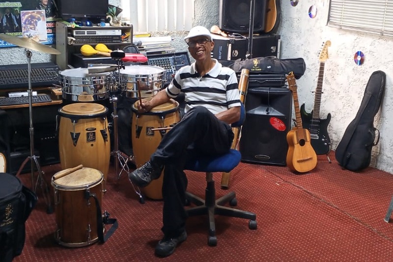 Hoy su academia de música en la Calle 9 suena como una descarga, timbales que responden