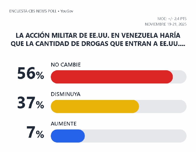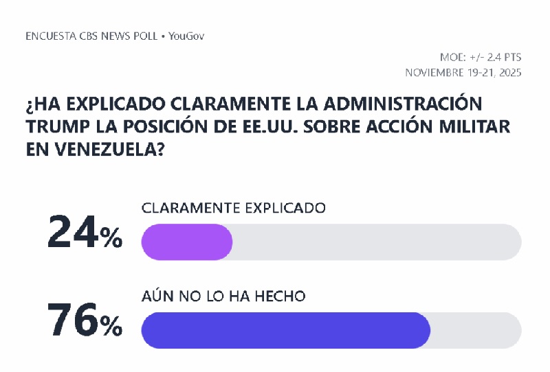 23/11/25.- Una encuesta de la televisora estadounidense CBS News revela profundas divisiones al interior de ese país sobre las políticas hacia Caracas. El 76% considera que la Casa Blanca no ha explicado su posición, mientras crece el escepticismo incluso dentro del Partido Republicano.