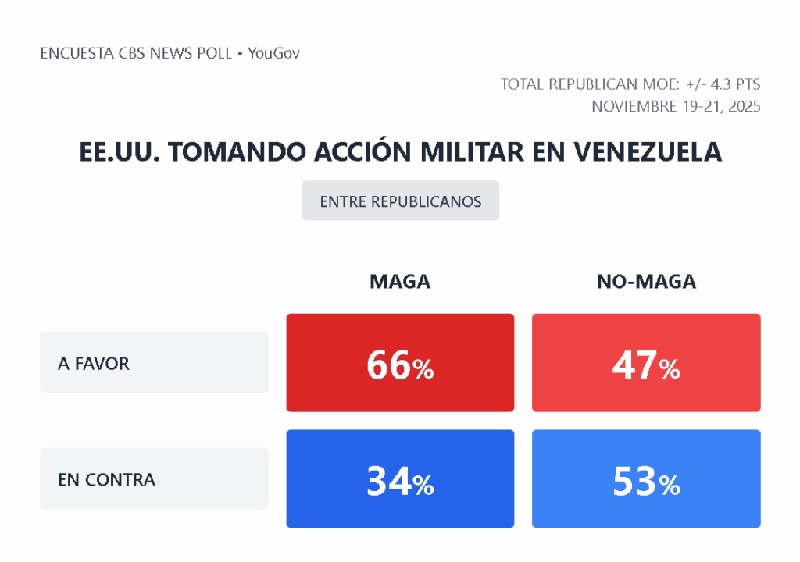 El sondeo, realizado entre el 19 y 21 de noviembre, con un margen de error de ±2.4 puntos porcentuales, revela grietas importantes dentro del Partido Republicano. Mientras 66% de los republicanos afines al movimiento MAGA respalda una posible intervención, solo 47% de los republicanos no-MAGA la apoya. Entre estos últimos, 53% se opone directamente a cualquier aventura militar.