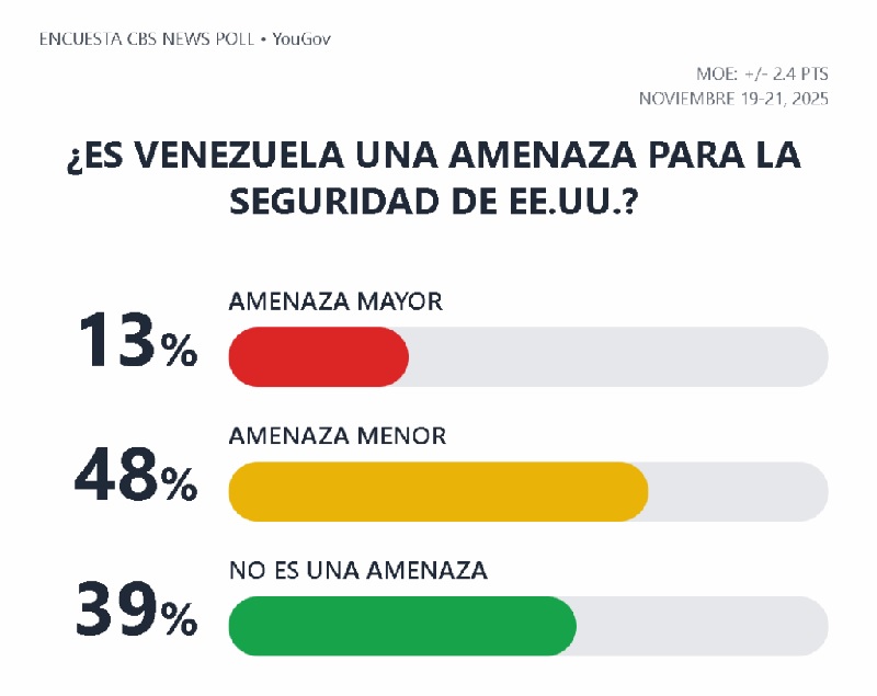 De acuerdo con el estudio de opinión de CBS, la percepción pública desmonta el discurso oficial. Solo 13% de los encuestados considera a Venezuela una “amenaza mayor” para la seguridad estadounidense. 48% la califica como “amenaza menor” y un significativo 39% sostiene que no representa amenaza alguna.