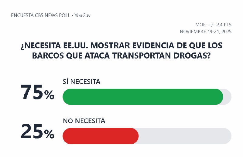 Esta incredulidad se extiende a las operaciones actuales. Los ataques contra embarcaciones sospechosas de narcotráfico dividen la opinión: 53% aprueba y 47% desaprueba. Pero aquí surge un consenso: 75% exige que el gobierno muestre evidencia de que los barcos atacados realmente transportan drogas.