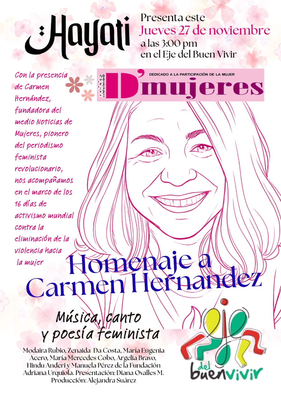26/11/25.- En el marco de la Campaña “16 días de activismo contra la Violencia de Género”, originados en la conmemoración anual del 25 de noviembre, Día Internacional de la Eliminación de la Violencia contra la Mujer, un grupo de periodistas, poetas y activistas militantes de la comunicación alternativa y la pedagogía popular feminista por una vida libre de violencia, convocan a celebrar este jueves 27 de noviembre la trayectoria de Carmen Hernández, fundadora del periódico Noticias de Mujeres (NdM), considerado el proyecto pionero de comunicación impresa del feminismo criollo.