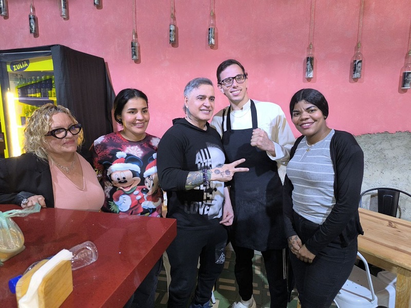 28/11/25.- Ataviado con suéter y mono del legendario rapero criollo Canserbero, a cuya alma supo hacer Justicia, llegó a El Cuchitril el fiscal general de la República.