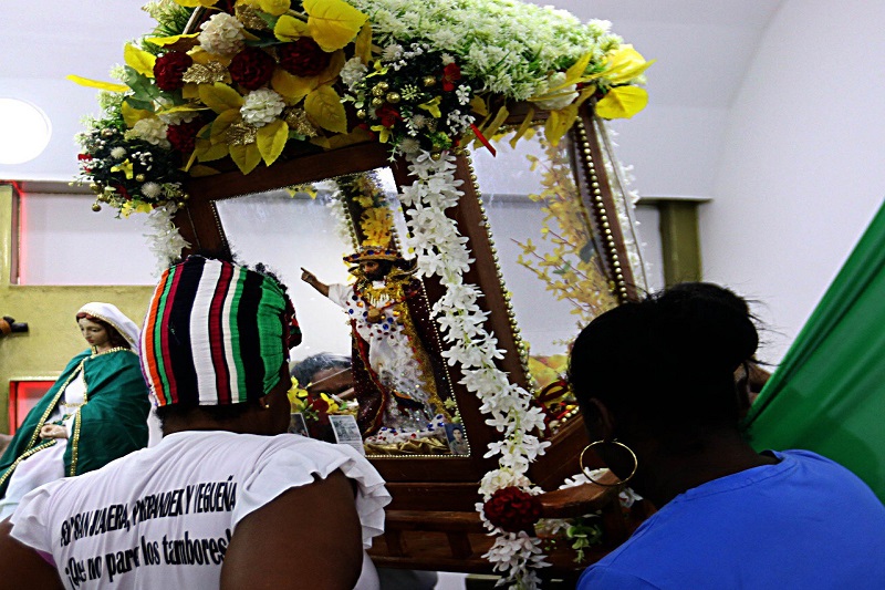 Al aproximarse a la capilla El Carmen, el santo, que venía cargado por los capitanes, es recibido por el custodio, quien lo entrega al primer capitán y al cura en la entrada de la Iglesia, desatando una ola de aplausos y vítores. Dentro, comienza la misa de Noche Buena Negra a las 11:00 pm. La música, fulías, sangueo, parrandas, guardas y golpes de tambor elevan el fervor.