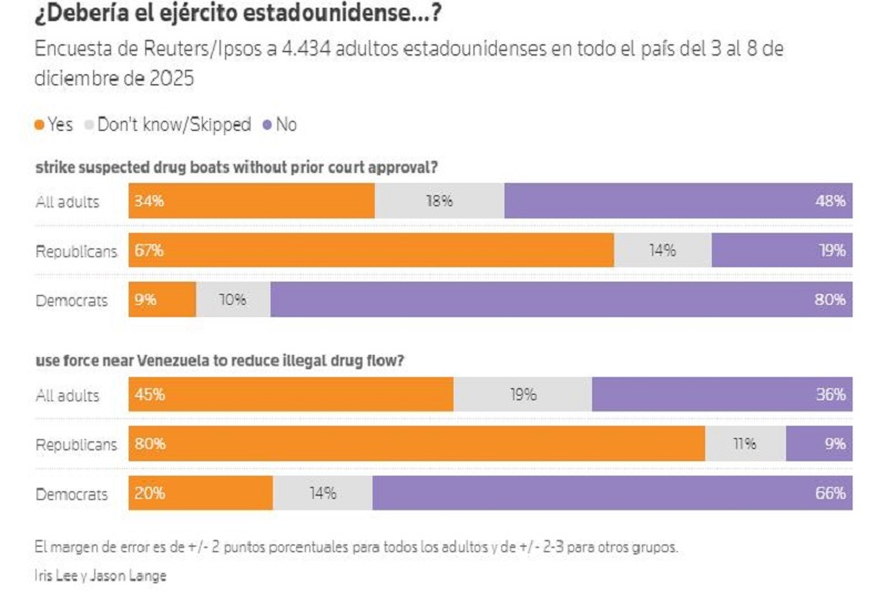 10/12/25.- Según la agencia de noticias británica Reuters, un amplio sector de los estadounidenses se opone a los ataques mortales ejecutados por el ejército de Estados Unidos (EEUU) contra barcos que supuestamente transportan drogas en aguas del Caribe.