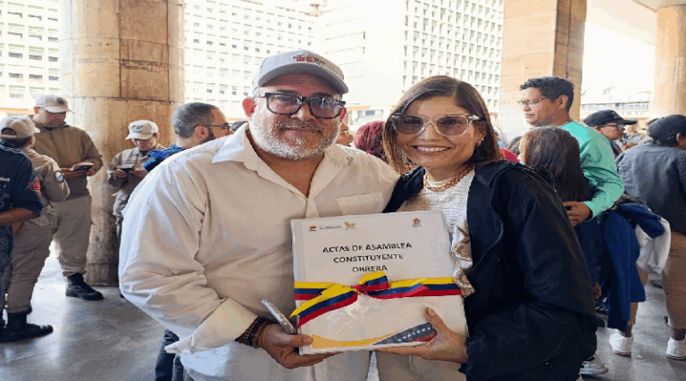 La viceministra para los Derechos y Relaciones Laborales, Johanna Santéliz, recibió las actas en representación del Ministerio, destacando el compromiso de la clase trabajadora con la construcción de una agenda transformadora.