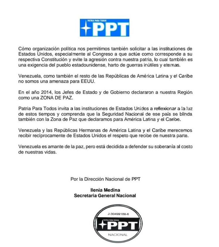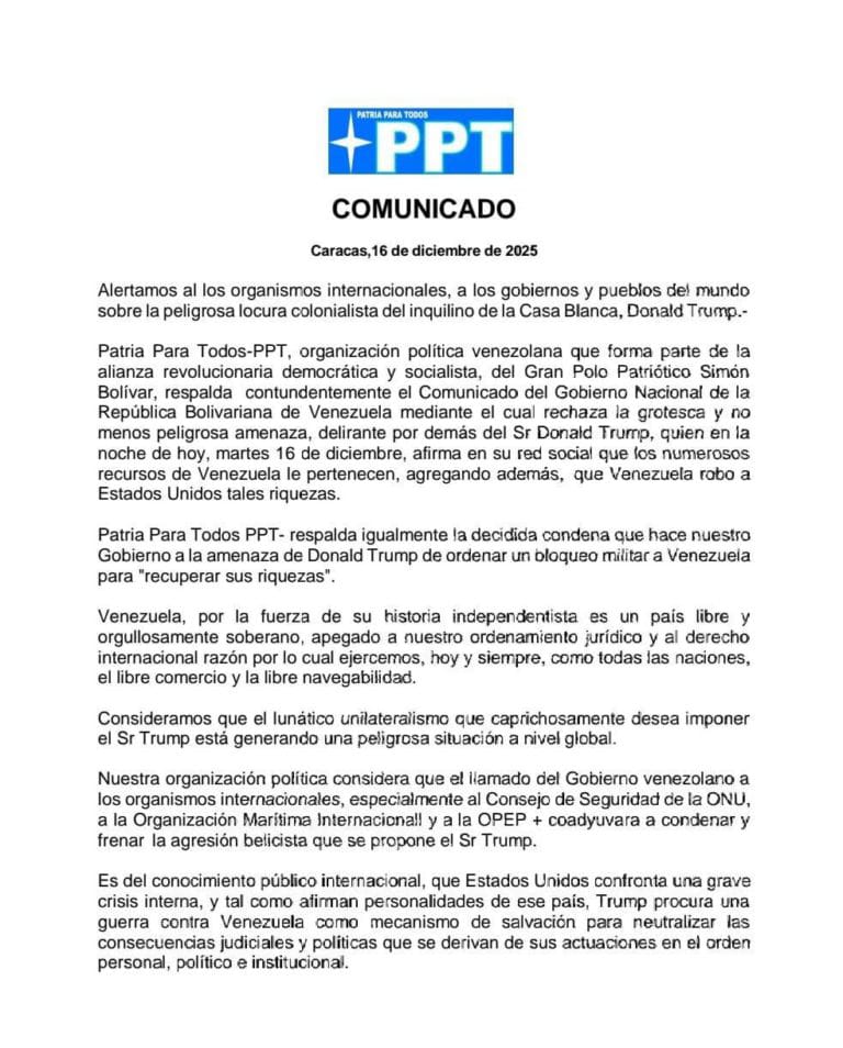 17/12/25.- La organización política Patria Para Todos (PPT) emitió un pronunciamiento oficial para alertar a la comunidad internacional, gobiernos y movimientos sociales sobre las recientes declaraciones del presidente de los Estados Unidos, Donald Trump, respecto a un posible bloqueo naval contra Venezuela.