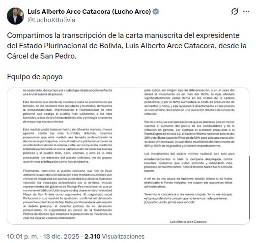La misiva, dirigida al pueblo boliviano, fue escrita a mano y luego transcrita por sus colaboradores para luego ser difundida en redes sociales. Arce fue detenido bajo cargos de “conducta antieconómica”, e “incumplimiento de deberes”.