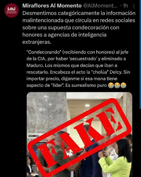"Desmentimos categóricamente la información malintencionada que circula en redes sociales sobre una supuesta condecoración con honores a agencias de inteligencia extranjeras”, se expresa en la publicación.
