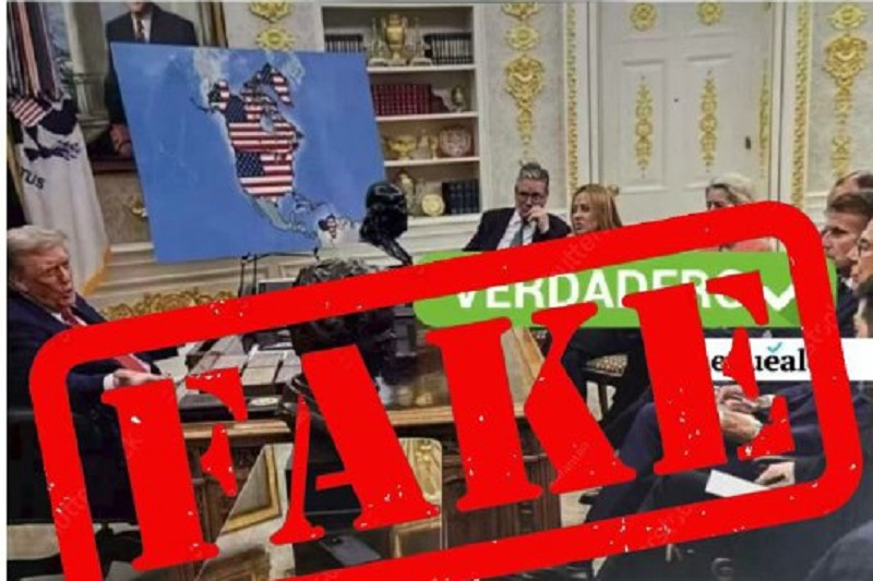 20/01/26.- El Gobierno de la República Bolivariana de Venezuela, por medio de la cuenta en X, Miraflores Al Momento (@AlMomento_M), desmintió con el sello “fake” la mentira que plantea el presidente de los Estados Unidos, Donald Trump, luego de que este publicara en su red social Truth Social una foto reunido con parte de su equipo de trabajo y al fondo una imagen de un mapa en el que el territorio venezolano y canadiense aparecen como anexados a la geografía de EEUU.