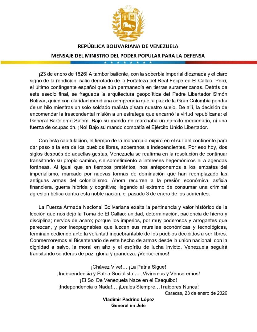 23/01/26.- El ministro para la Defensa, Vladimir Padrino López, conmemoró este viernes el Bicentenario de la Victoria en El Callao, batalla que marcó la expulsión definitiva de las fuerzas españolas de América del Sur.