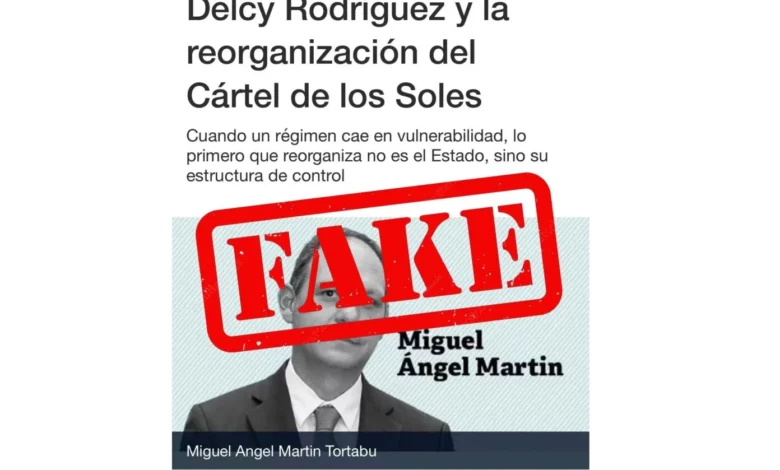 A través del perfil oficial Miraflores Al Momento en la red social X, el Ejecutivo venezolano calificó de falsas las publicaciones del Diario Las Américas, específicamente un artículo de Miguel Ángel Martín donde asegura que la presidenta encargada, Delcy Rodríguez, reorganiza el inexistente Cártel de los Soles.
