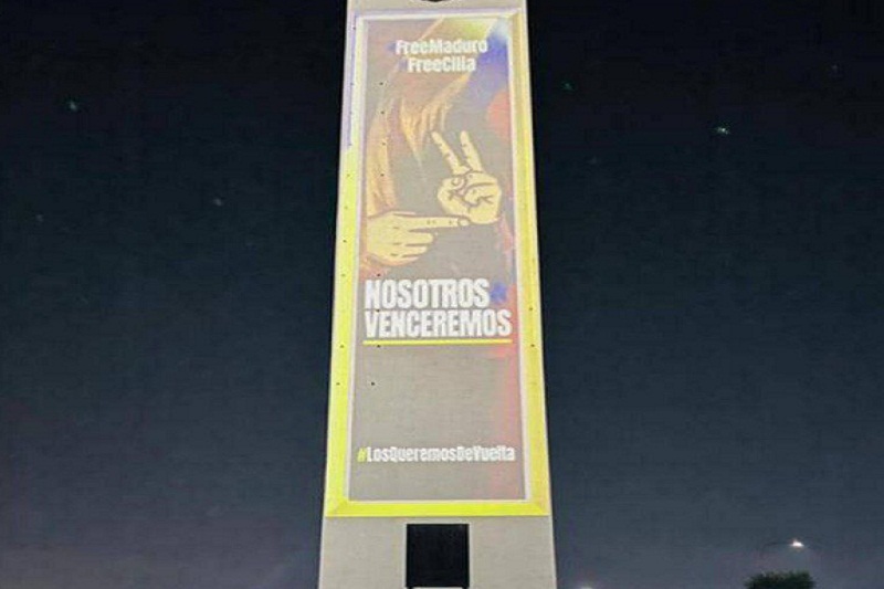 La imponente estructura fue iluminada con las etiquetas #FreeMaduro, #FreeCilia, además de fotografías de Nicolás y Cilia, para exigir su inmediata liberación y regreso a Venezuela con la frase “Los queremos de vuelta”.