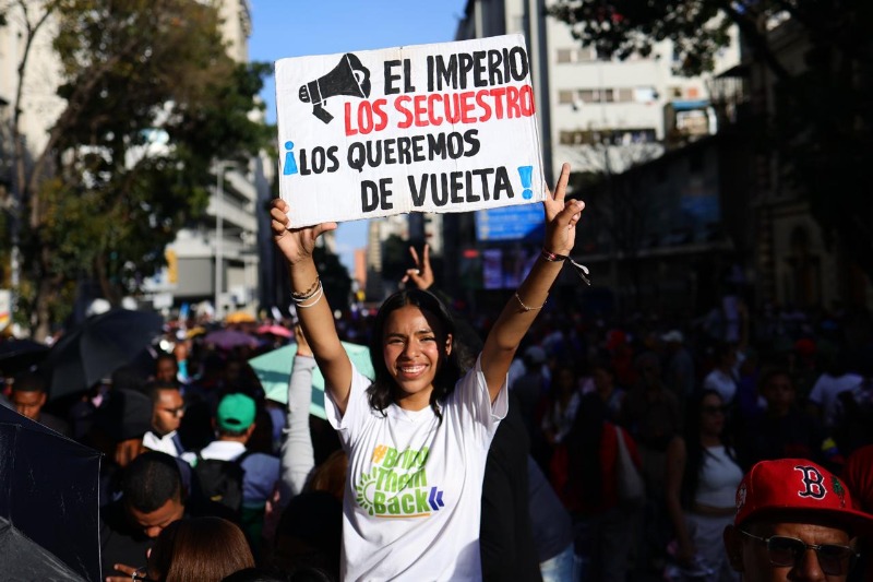 03/02/26.- La tarde del 3 de febrero se tiñó de esperanza y dignidad nacional cuando miles de venezolanos, marcharon desde Plaza Venezuela hasta la esquina de Santa Capilla, en una manifestación cívica, que conmemoró un mes de los bombardeos y ataques militarizados perpetrados por Estados Unidos, eventos que derivaron en el secuestro de la pareja presidencial Nicolás Maduro y Cilia Flores.