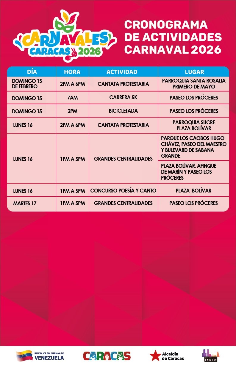 13/02/26.- La Alcaldía de Caracas y el Gobierno del Distrito Capital han presentado oficialmente el cronograma de actividades para los Carnavales 2026, una agenda que combina cultura, deporte y recreación comunitaria en las 22 parroquias de la ciudad.