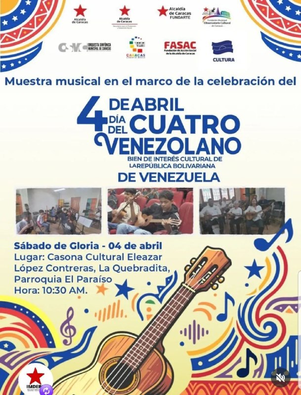Se invita a la familia caraqueña a compartir y disfrutar de las magistrales agrupaciones y exponentes del cuatro que harán vibrar los acordes del instrumento popular que une a todo el pueblo venezolano, con el conocido cambur pintón.