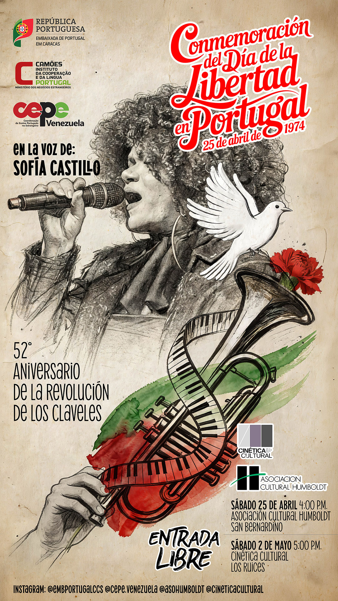 La iniciativa se realizará en alianza con el Camões – Instituto da Cooperação e da Língua I.P., CEPE Venezuela, la Asociación Cultural Humboldt (25 de abril) y Cinética Cultural (2 de mayo), espacios donde se realizarán los conciertos.